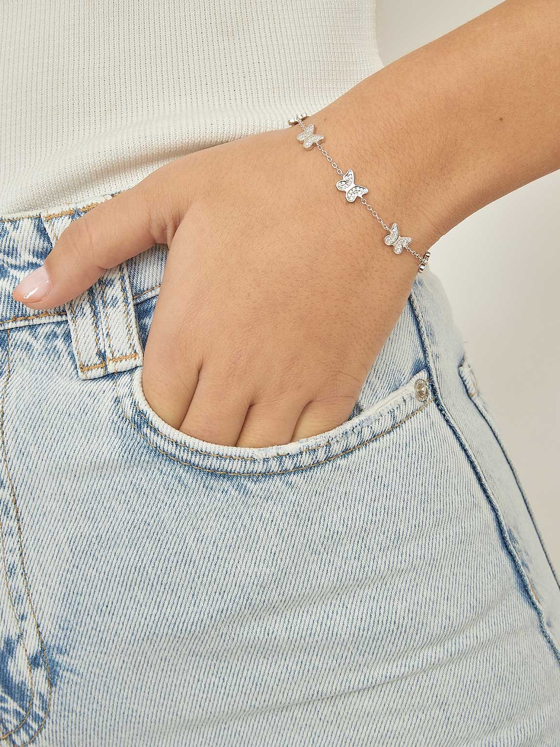 Pulseira Delicada, Prata de lei 925, Zircónia de cultivo, Claro, Borboleta, Feito à mão,, Prateado, 3.34 gramas.